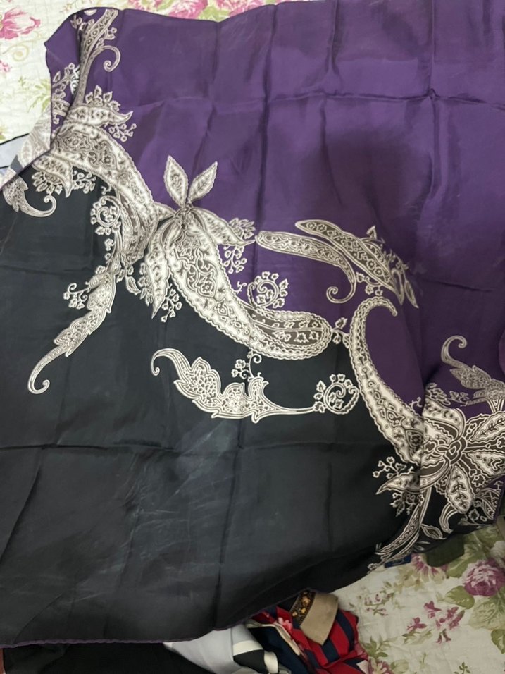 Levidoor marka eşarp lekeler mevcut İpek dokulu, mor ve siyah renklerde, bohem desenli ve drapeli kadın şalı.