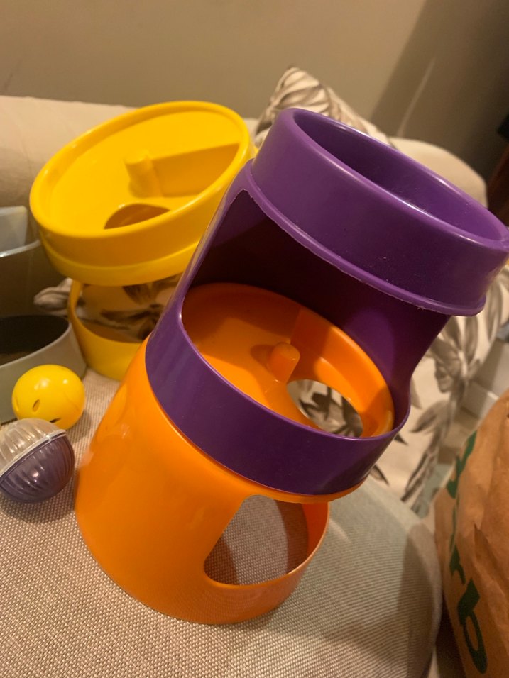 Mor ve turuncu renklerde, iç içe geçebilen delikli çocuk oyuncağı. İçinde küçük toplar bulunur, çocuklar için eğlencelidir. En üsten topları delikten yuvarlayarak oynanır