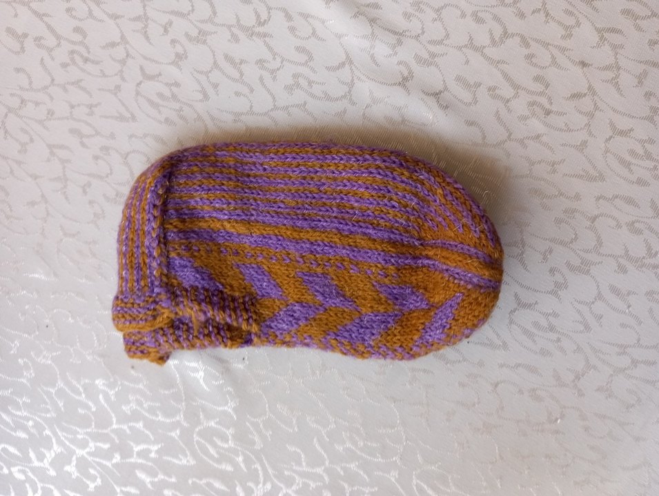 Mor ve turuncu renklerde örülmüş, dokulu yüzeye sahip, ısı korumalı örgü fırın eldiveni.