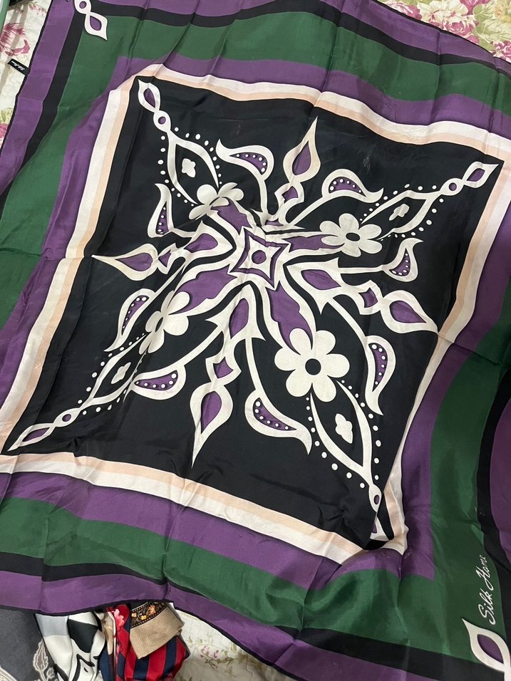 Silk home marka eşarp deformesi fotoğrafta mevcut Mor ve yeşil tonlarında, çiçek desenli, yumuşak ve ipeksi dokulu, bohem tarzda kadın fular.