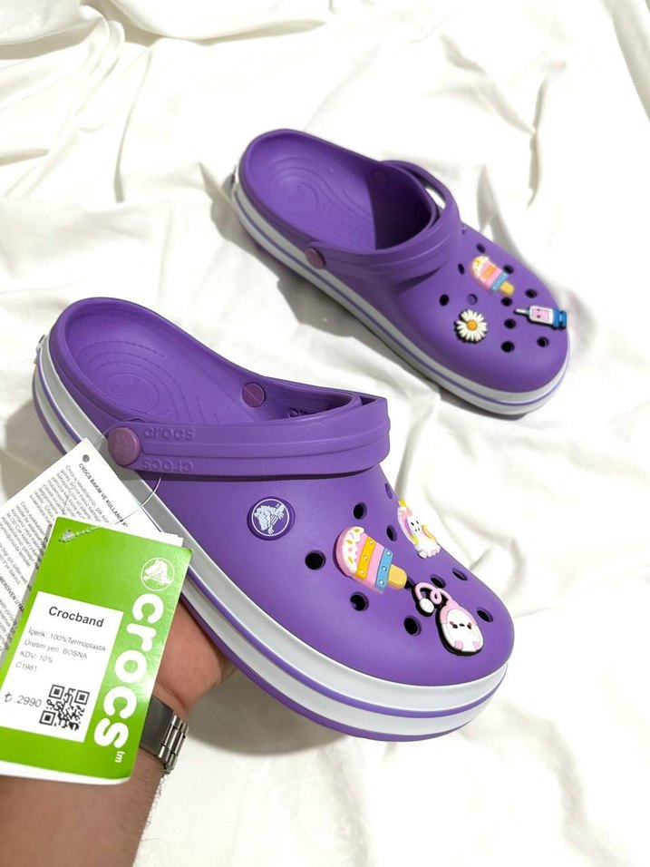 Mor kauçuk kız terlikleri, renkli baskılı desenler ve ayarlanabilir Velcro bant ile. Pop kültür esintili, trend ve rahat stil.