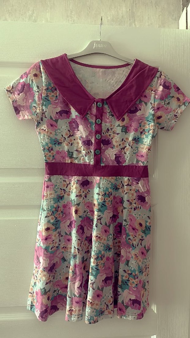 Düğmeli, yakalı ve kısa kollu bu mor vintage kız elbisesi, pastel çiçekli baskıya sahip yumuşak tekstilden yapılmıştır. Bohem tarzını yansıtır.