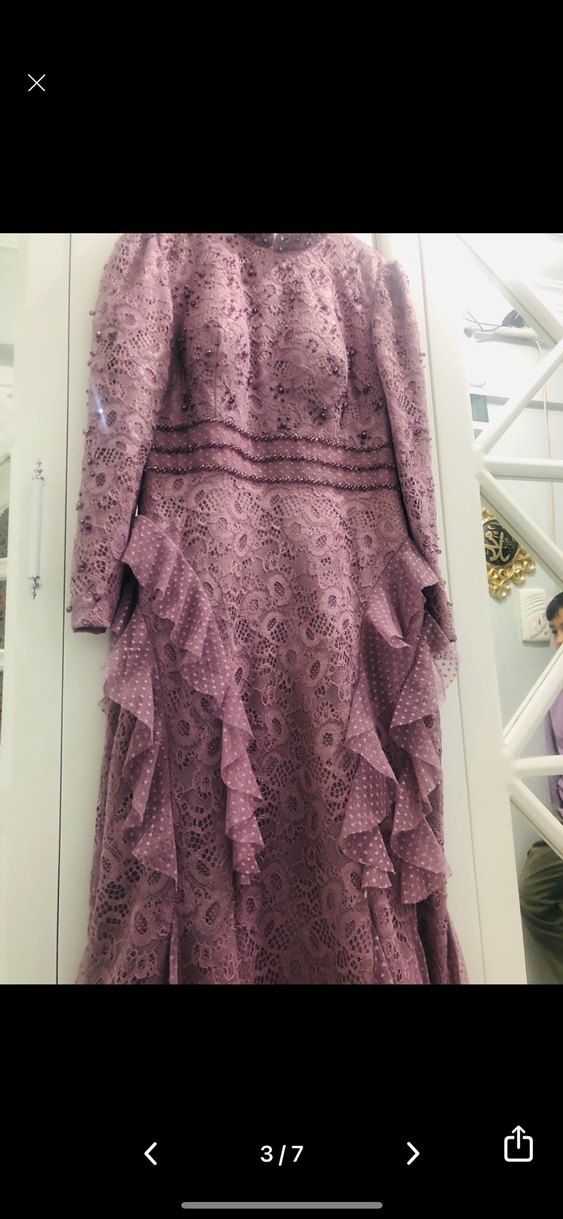 Mor vintage nakışlı uzun kollu, yüksek yakalı abiye elbise. Vücuda oturan kesimi ve fırfır detayları klasik zarafeti ve bohem tarzı yansıtıyor.