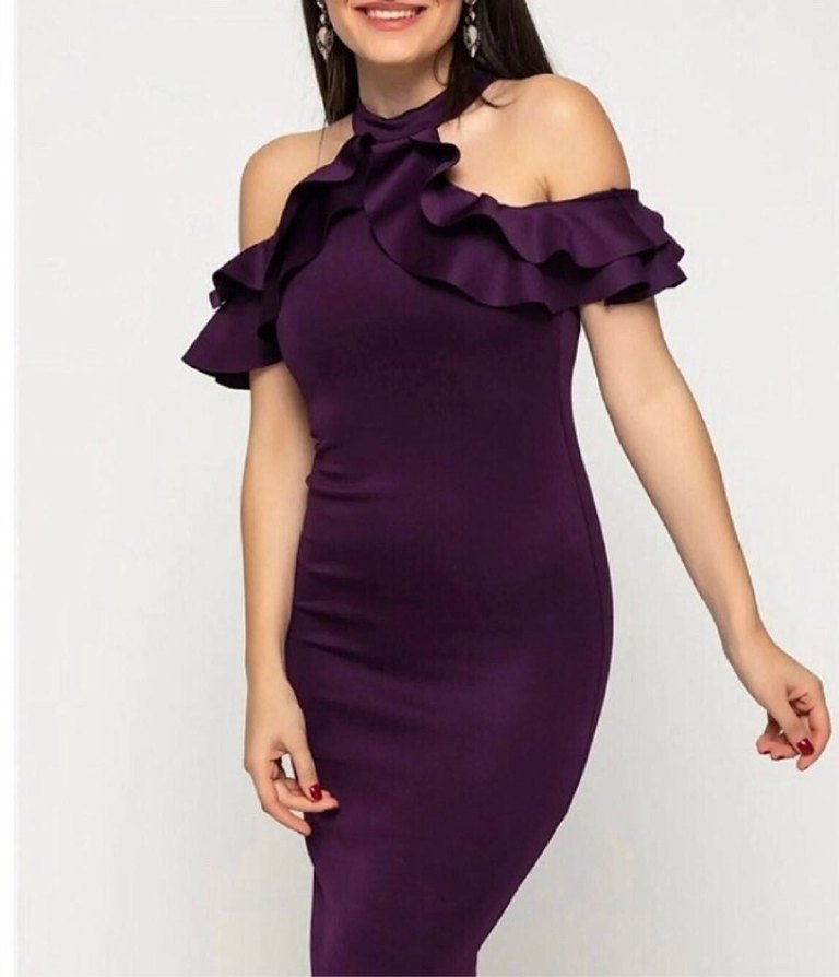 Bu mor, vücuda oturan midi elbise, straplez yakası ve volan detaylarıyla çağdaş ve gösterişli bir tarz sunar, partiler için uygundur. Ürün sadece söz de kullanılmıştır. Yepyeni, hiçbir kusuru yoktur. Scuba kumaş S-M-L bedenler tercih edebilir.