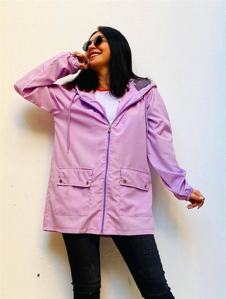 Mor midi boy, bol kesim, uzun kollu, çıtçıtlı cep ve fermuarlı, sentetik kumaş yağmurluk. Bol kesim sevenler s/m giyenlere de olur.