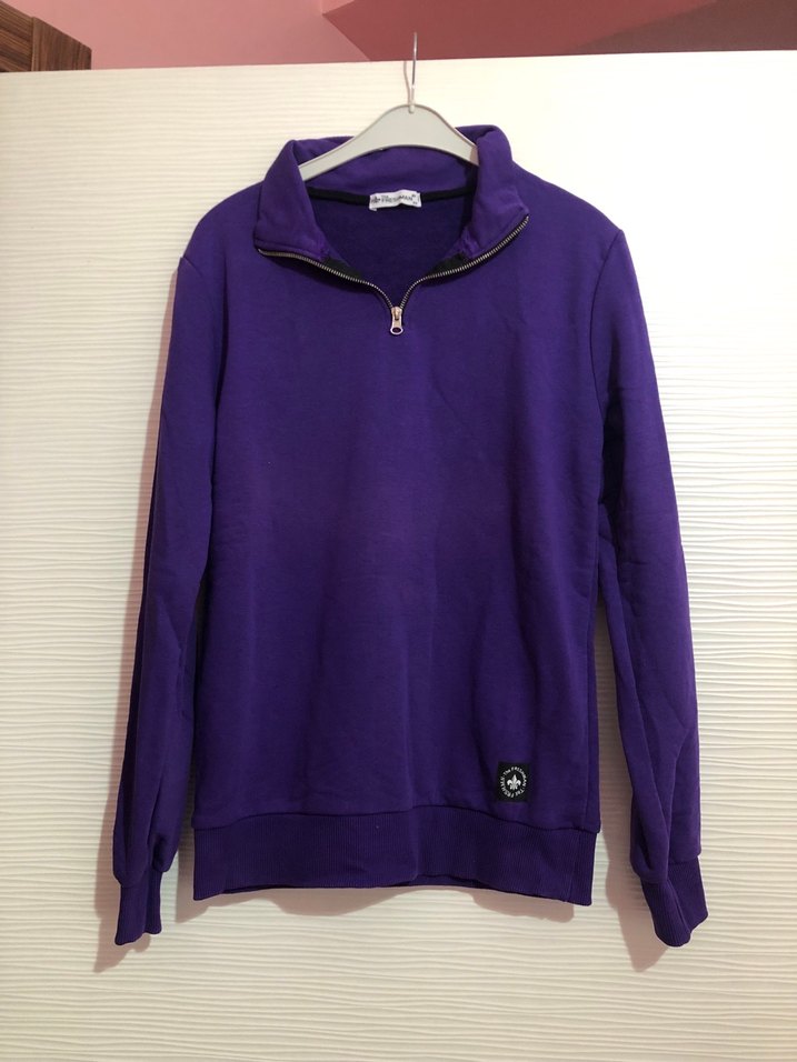 Mor renkte, yarım fermuarlı yüksek yakalı sweatshirt. Uzun kollu ve bol kesim, yumuşak kumaştan rahat bir günlük kullanım ürünü.
