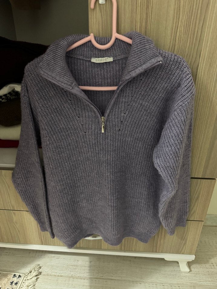 Mor renkte, örgü kumaştan yapılmış, yarım fermuarlı yüksek yakalı, uzun kollu, bol kesim ve normal boyda kadın kazak.