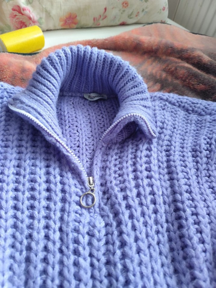 Yarım fermuarlı, yüksek yakalı, uzun kollu mor örgü kazak standart esnek kumaş