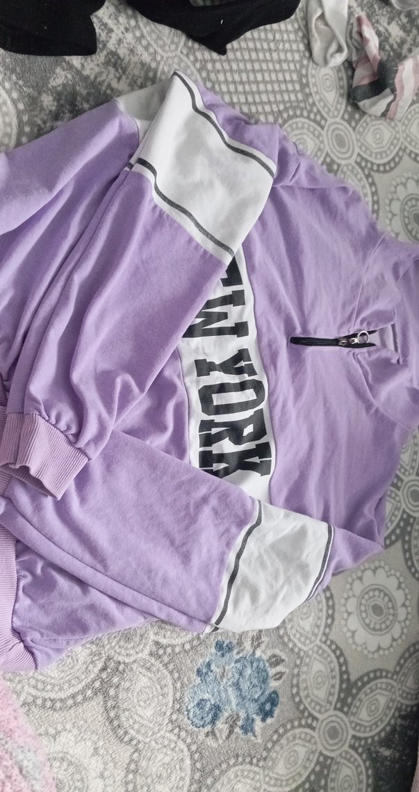 Mor renk, uzun kollu, yüksek yakalı yarım fermuarlı sweatshirt. Sentetik kumaştan, rahat kesim ve baskılı desenli. Günlük kullanım için uygundur.