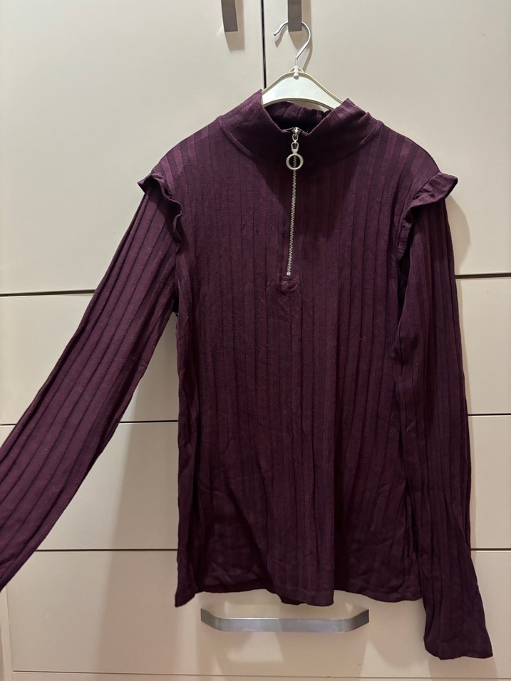 Mor, yarım fermuarlı, yüksek yakalı, uzun kollu, pileli detaylara sahip, rahat ve şık uyumlu kadın kazak. Günlük kullanıma uygun.