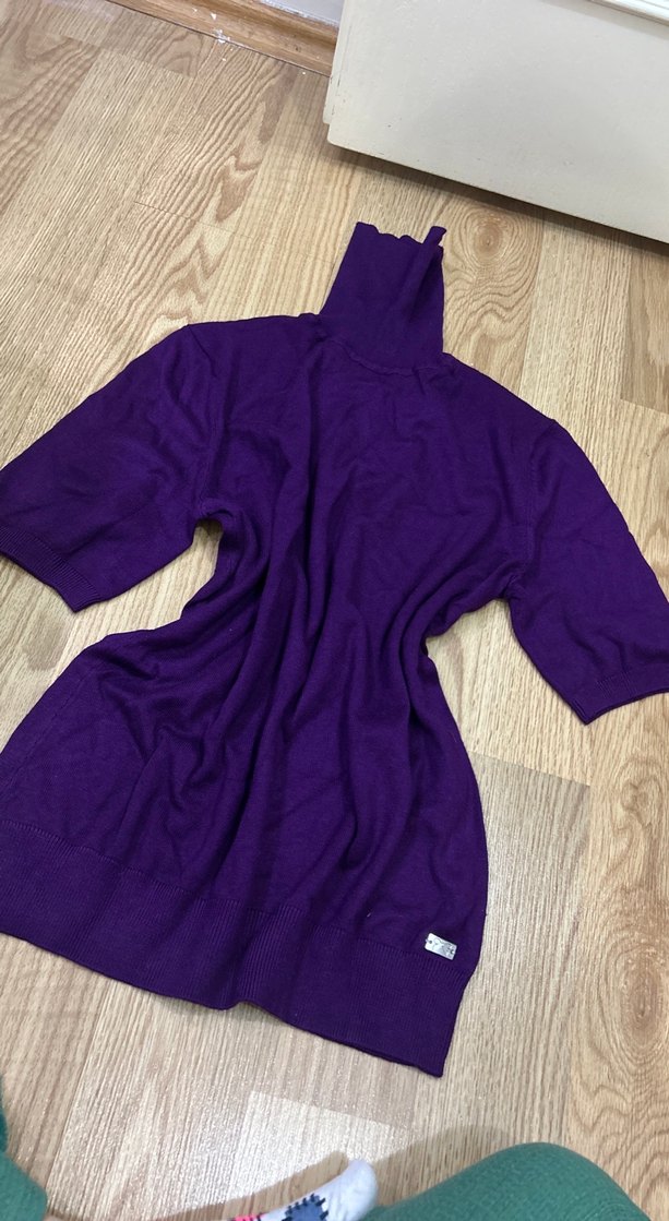 Mor, parlak görünümlü, yarım kollu, balıkçı yaka, bol kesim, uzun boy örgü kazak. Yumuşak ve sıcak kumaştan, günlük kullanım için uygundur.