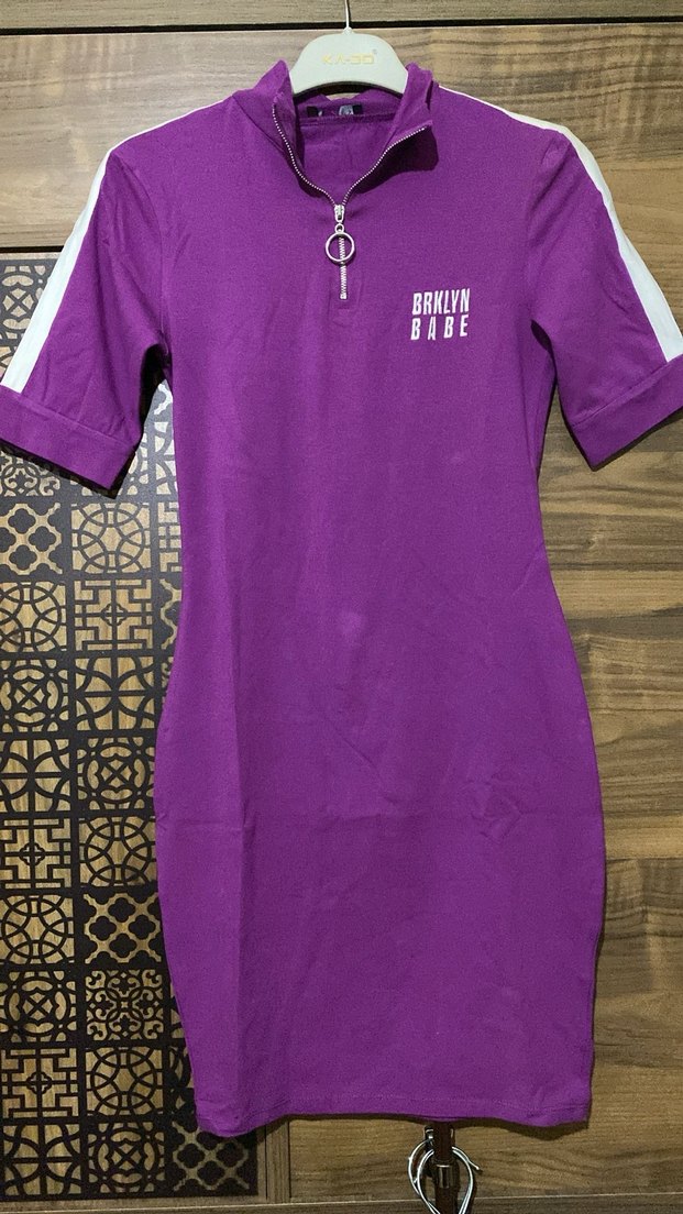 Mor renkli, yarım kollu, fermuarlı yüksek yakalı, baskılı ve vücuda oturan midi elbise. Günlük kullanıma uygun şık tasarım.