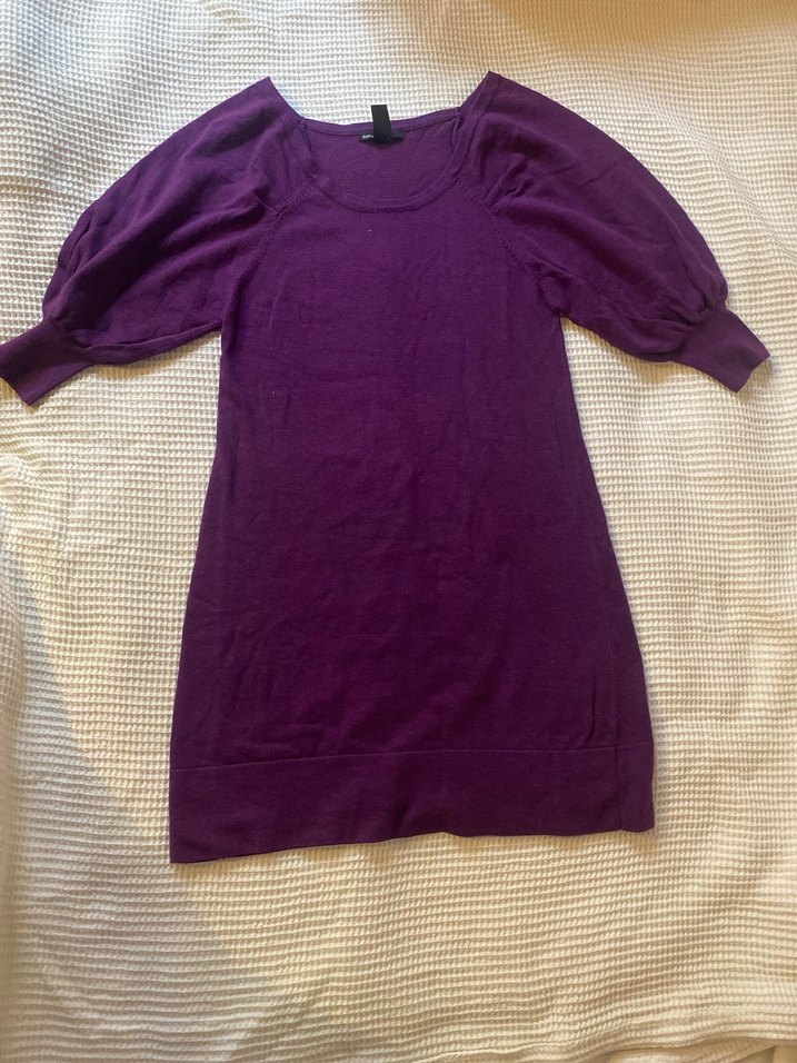 Mango, Mor renkli, yarım kollu, kolları bol kesim, dar triko elbise. Pamuklu dokuma, yuvarlak geniş yakalı ve mini boyda, günlük kullanım için uygundur.