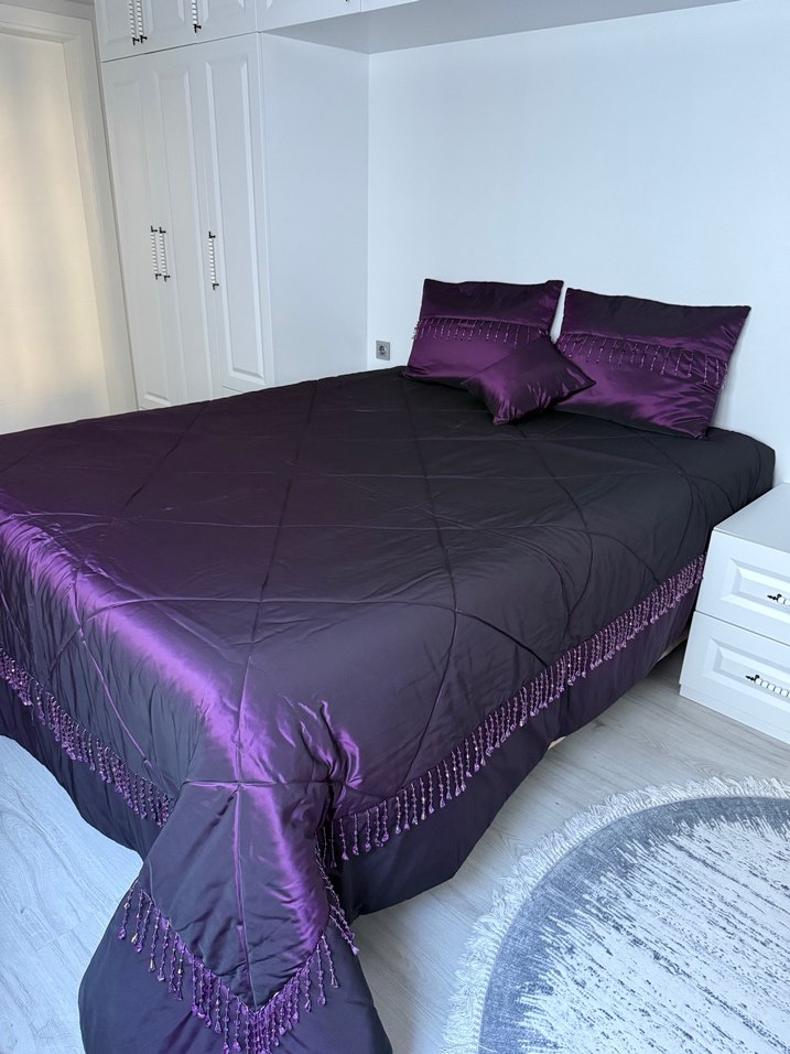 Mor tonlarında, taş işlemeli yatak örtüsü ve uyumlu yastık kılıflarıyla şık bir görünüm sağlar.Hediye geldi. Hiç kullanılmadı. Fotoğraf için yatağa serildi. Original çantasında gönderilecek. Marka brilliant. Fotolarda marka görünüyor.
