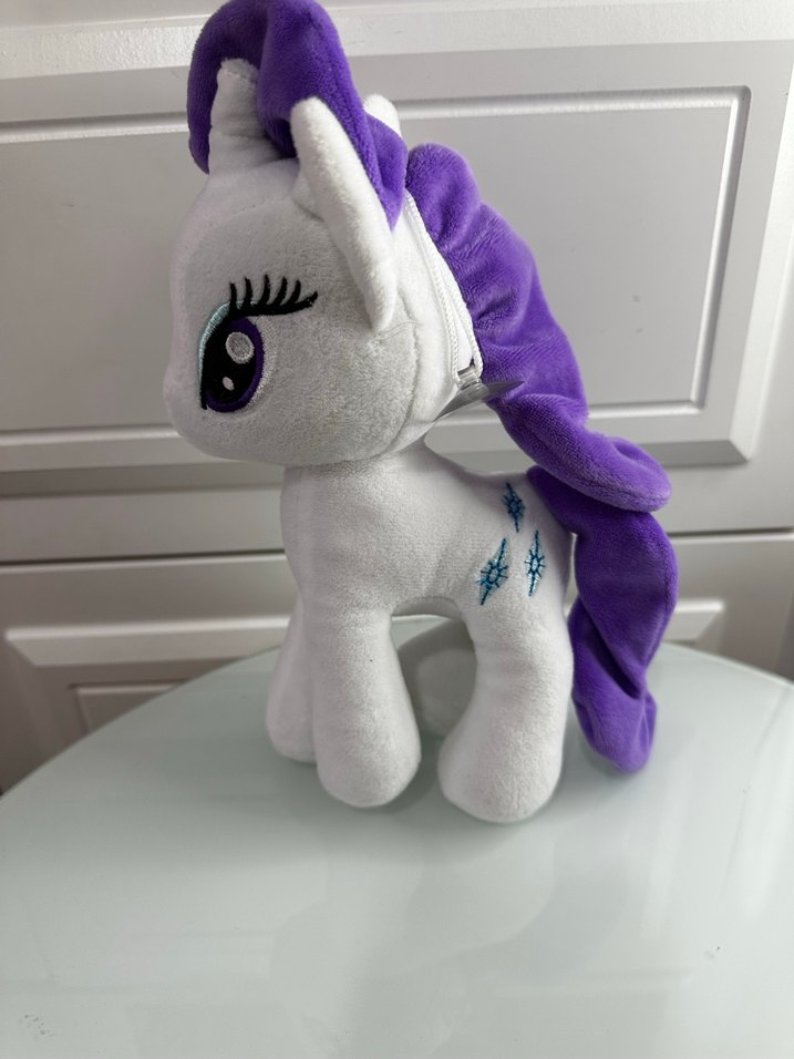 Yumuşak gri gövdesi ve canlı mor yele ile kuyruğu olan peluş at oyuncak, işlemeli gözler ve desenlerle detaylandırılmıştır.
