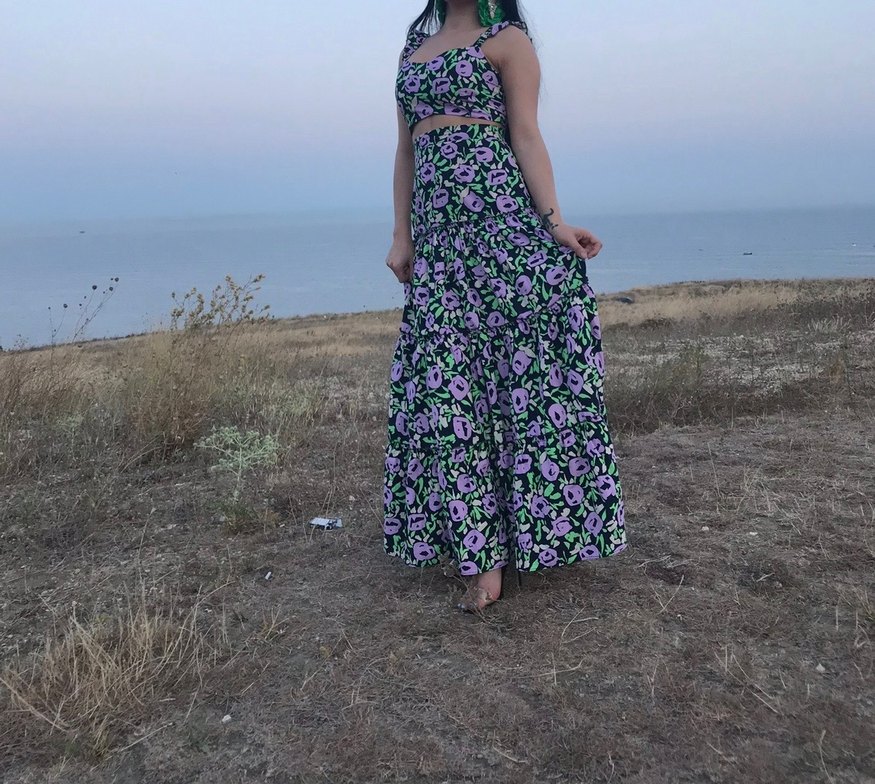 Etek Bel 64 cm , boy 98 cm fermuarlı belden , xs beden . Crop son görsellerdeki gibi lila askıları desenlidir. 1 kez giyildi