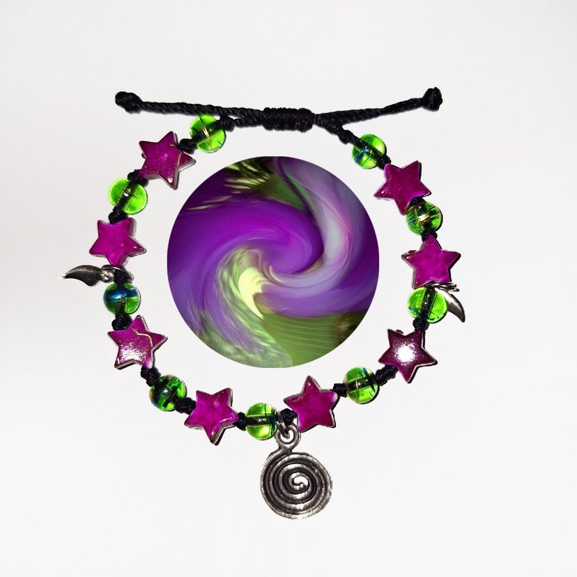 Mor yıldızlı spiral charmlı yeşil ayarlanabilir ipten bileklik