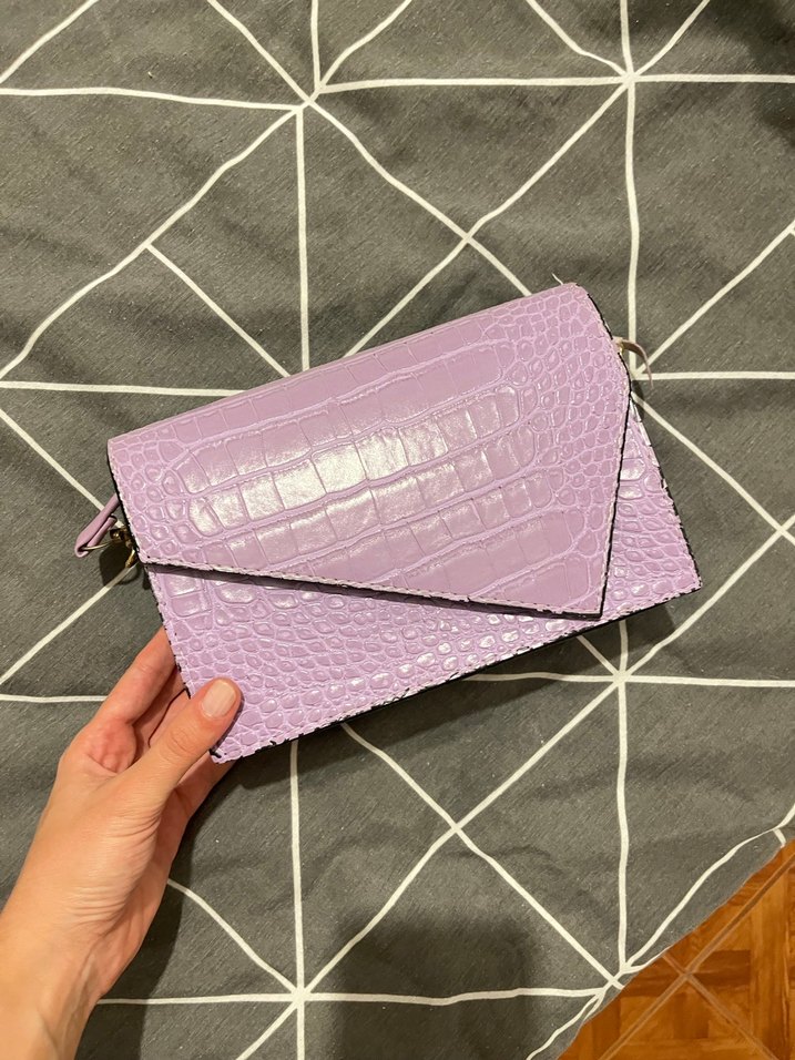 Pastel mor yılan desenli deri kadın çanta, fermuarlı ve sokak modasına uygun günlük kullanıma ideal.