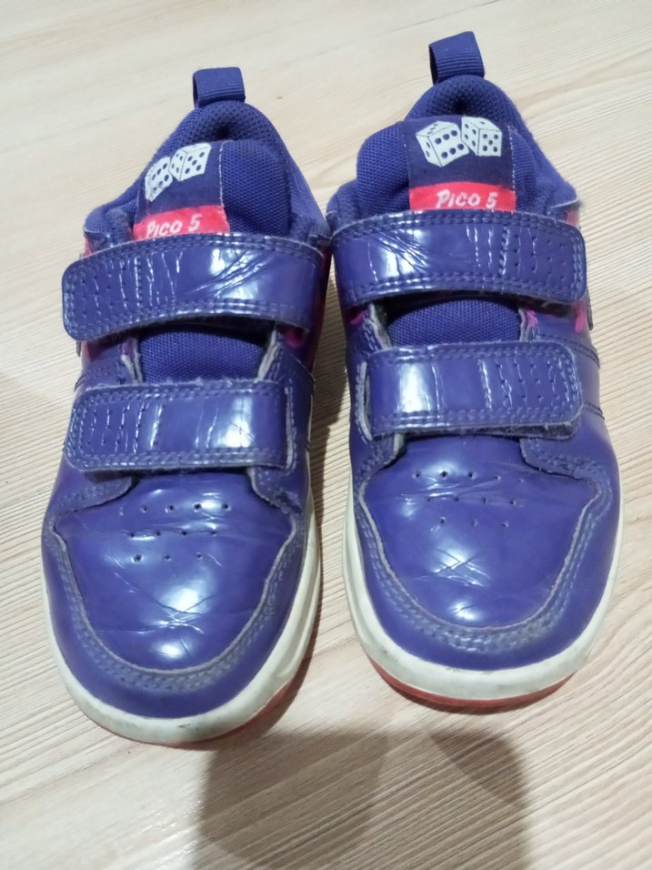 Mor renkli, desenli ve cırt cırtlı çocuk spor ayakkabısı. Kauçuk tabanlı, üzerinde "PICO5" yazısı bulunur. 28.5 numara