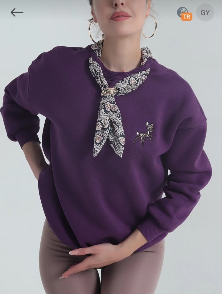 Parlak yılan desenli, mor renk, uzun kollu, oversize kesim, örme kumaştan sweatshirt. Fularlı sweat mor