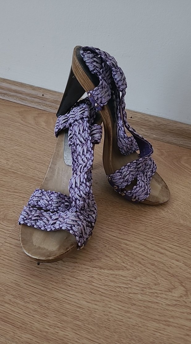 Mor yılan desenli, tokalı bantlara sahip platform topuklu sandalet, sentetik kumaştan, bohem tarzda.