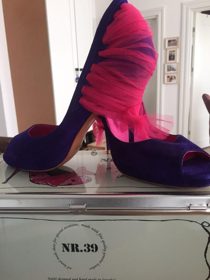 İpek gibi mor yüksek topuklu kadın abiye ayakkabı, pileli pembe batik detaylı, avangard parti tarzı için uygun. Numara 39.