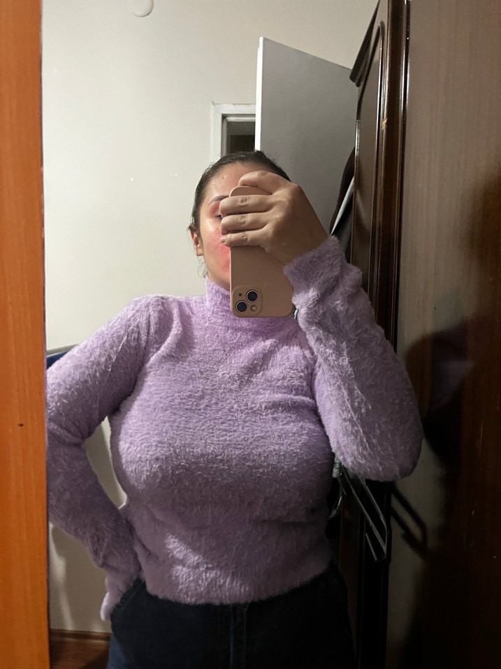 Mor pastel renkte, yüksek yakalı ve uzun kollu ince örgü kadın kazak. Normal midi boyda, rahat ve deseniz, günlük kullanıma uygun.