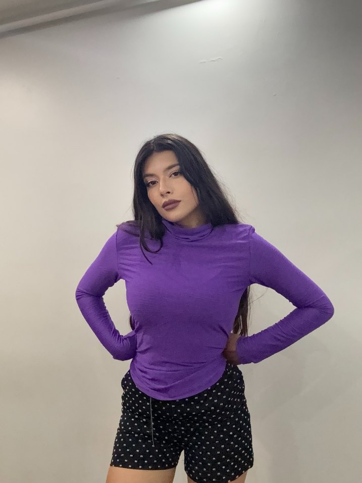 Büyük geliyor bana M beden Mor, yüksek yakalı, uzun kollu, vücuda oturan kadın bluz. Satenimsi kumaştan, minimalist ve rahat şıklık sunar.