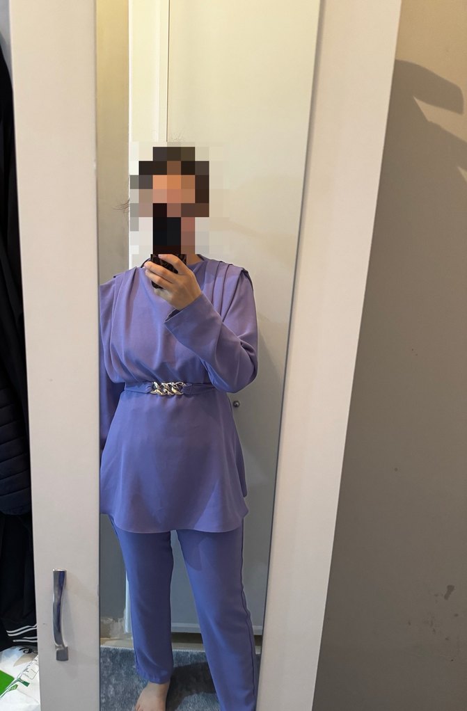 Mor renkli, yüksek yakalı ve uzun kollu kadın takım elbisesi, ipeksi kumaştan, normal kesim ve midi boyda. Minimalist, desensiz tasarımıyla ofis için şık ve rahat bir seçenek sunar.
