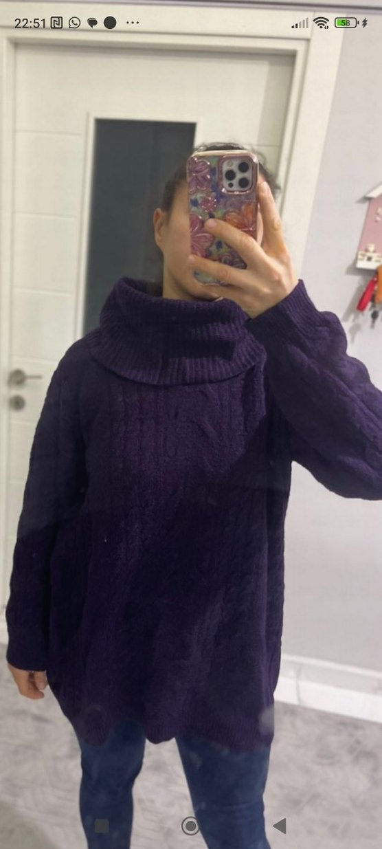 Mor yüksek yakalı, uzun kollu ve bol kesim örgü kazak, rahat ve günlük sokak stili için uygundur.