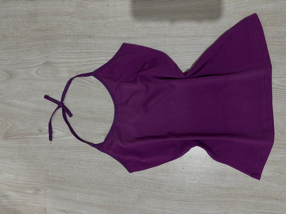 Bu mor tunik, yüksek yakalı ve kolsuz olup, sentetik kumaştan yapılmıştır. Drapeli ve midi boyda, günlük kullanım için uygundur.
