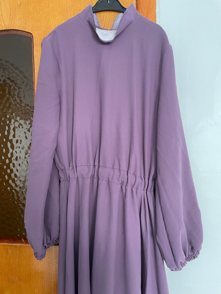 Mor renkli, keten kumaştan yapılmış, yüksek yakalı ve bol kesimli uzun elbisedir. Uzun kollu ve drapeli tasarımıyla minimalist tarzı yansıtır.