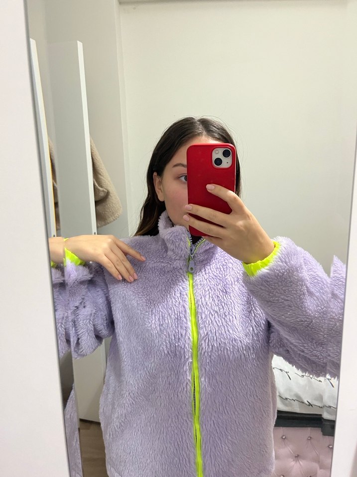 Yüksek yakalı, uzun kollu ve fermuarlı, yumuşak ve sıcak dokulu mor renkli, pastel tonlarda rahat kesim kadın ceket.