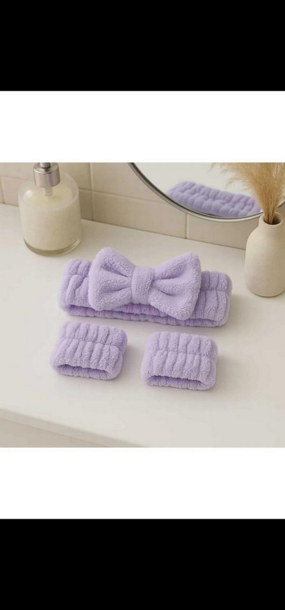 Yumuşak kumaştan yapılmış, fiyonk detaylı mor saç bandı ve iki uyumlu bileklik içeren set. Rahat stili için uygundur. Suyu emici özelliğe sahip bilekliği yüzünüzü yıkarken suyun dirseklerinize akmasını engeller