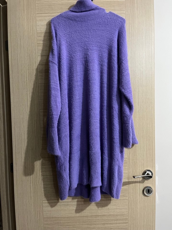Mor renkli, yüksek yakalı ve uzun kollu örgü kazak, bol ve uzun kesimiyle rahatlık sunar. Yumuşak örgü kumaşıyla günlük kullanım için uygundur.