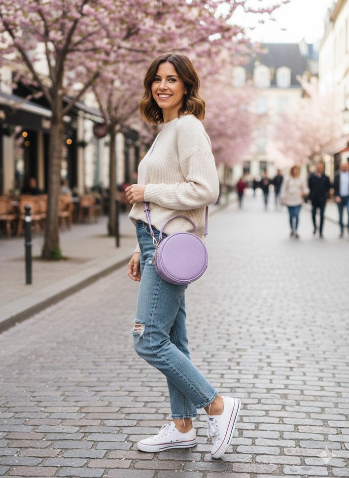 Pastel mor renkte, bağlama desenli denimden yuvarlak çapraz çanta, gündelik sokak stili için zahmetsiz şıklık sunar.