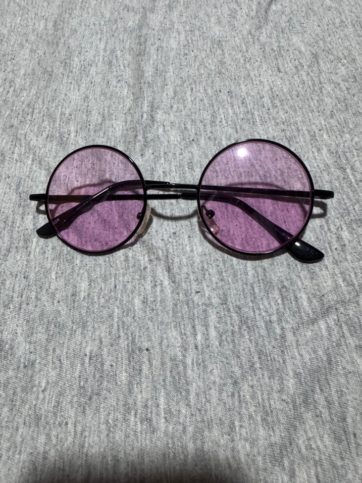 Mor yuvarlak, transparan camlı ve minimalist çerçeveli kadın güneş gözlüğü, gotik ve retro tarzları bohem bir görünümle birleştiriyor.