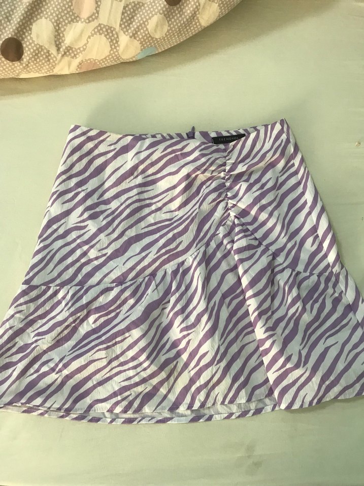 Mor zebra desenli, pilili mini etek. Sentetik kumaştan, bol kesim ve sokak tarzı için uygun. Rahat ve şık görünüm sağlar.