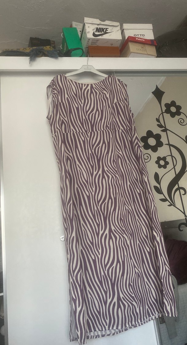 Mor ve gri zebra desenli, uzun ve kolsuz elbise. Tekne yaka ve pile detayları bulunur. Sentetik kumaştan, rahat kesimlidir ve günlük kullanıma uygundur.