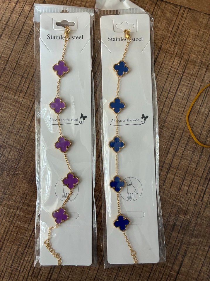 Paslanmaz çelikten, mor zincir detaylı, baskılı bohem dört yapraklı yonca desenli bileklik. Günlük kullanıma uygun.