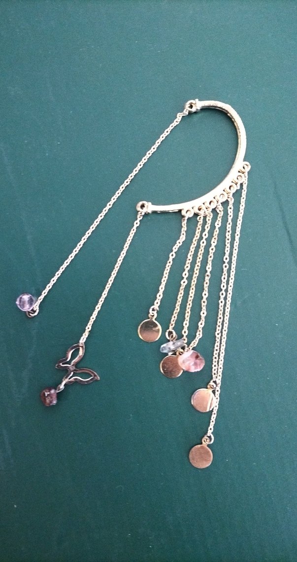 Mor renkte, zincir detaylı ve küçük disk figürlü bohem tarzda kadın küpesi, günlük kullanıma uygundur. Az kullanılmış, bir zinciri kopuktur, fakat kulağa takıldığında farkedilmez.
