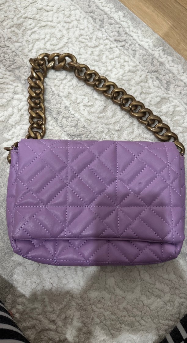 Sentetik kumaştan, zincir detaylı pastel mor kadın çantası. Kapitone deseniyle günlük sokak stiline uygundur.