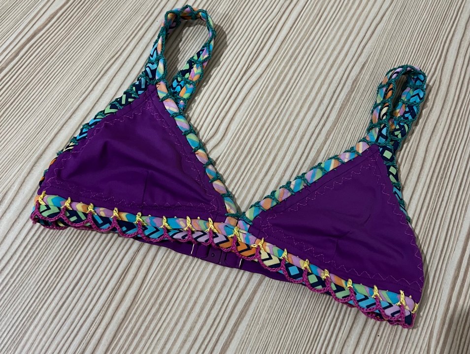Mor bikini üstü, renkli nakışlı kenar ve zincir detaylarına sahiptir. Askıları ince ve vücuda oturan kesimdedir, bohem parti tarzı için uygundur.80/85 uyumlu … renk solması yok …