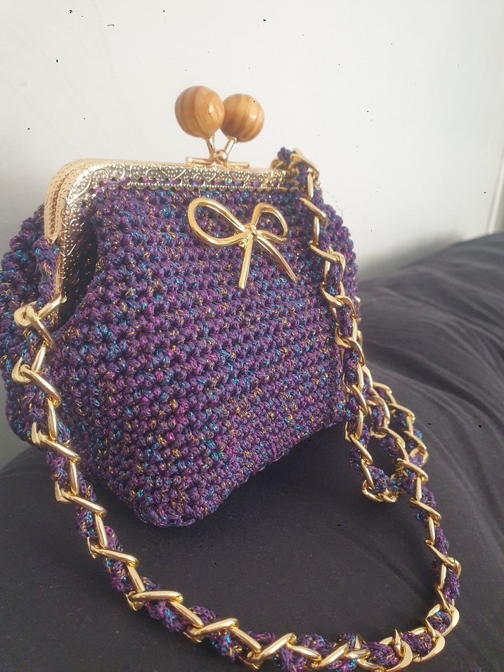 Mor renkli, zincir detaylı örgü kadın çanta. Vintage esintili fiyonk süsü ve bohem tarzıyla günlük kullanıma uygundur.