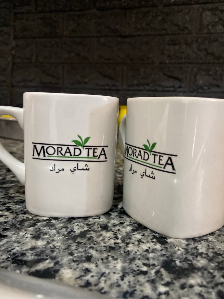 Morad Tea logosu ve yeşil yaprak detayı bulunan beyaz seramik kupalar, sıcak içecekler için uygundur. ☕
