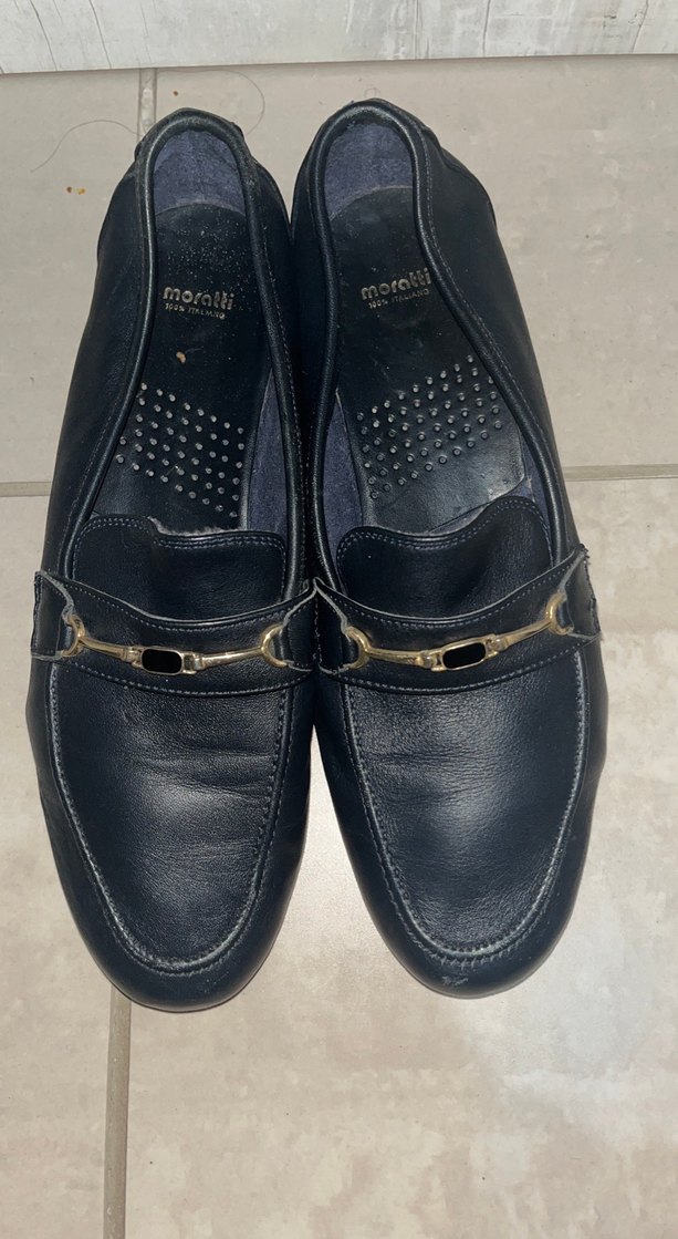 Moratti markalı, parlak altın tokalı, siyah deri erkek loafer ayakkabı, klasik ofis tarzı için uygun.