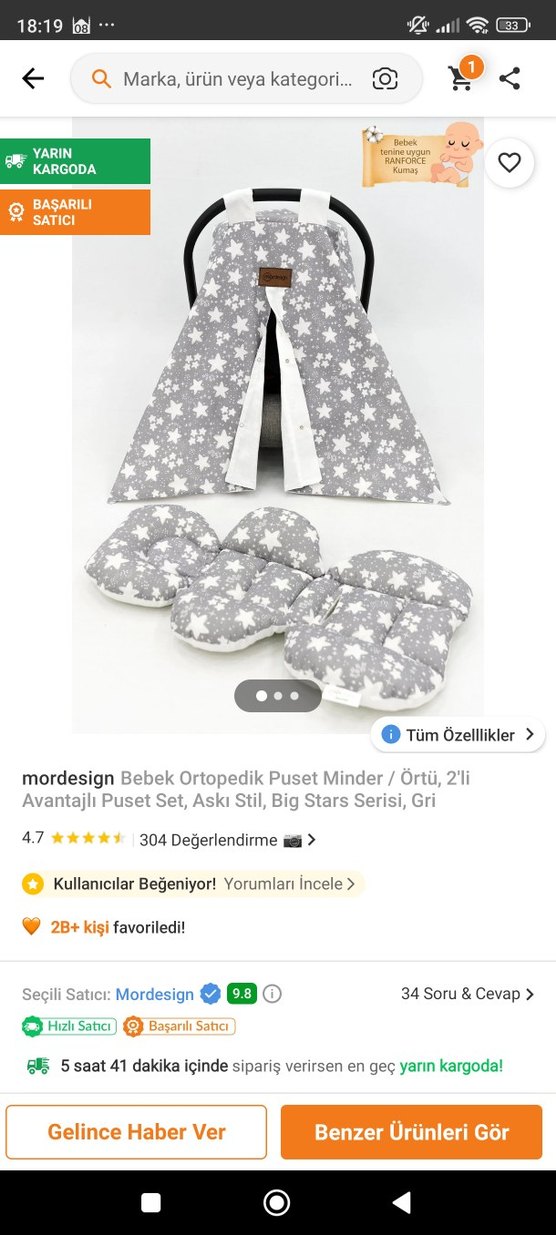 Mordesign bebek ortopedik puset minderi ve örtü seti, gri yıldız desenli iki parçadan oluşur. Yumuşak ve destekleyici dolgu ile rahatlık ve doğru duruş sağlar. Askı stili ile kolay takılır. az kullanıldı