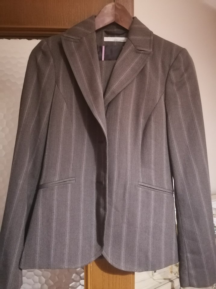 More & more marka şık kadın takım elbise 34 beden. Pantolon kısmı bilekte dir. Pantolon uzun değildir. Ürün defosuz dur. Kahverengi üzerine ince pembe çizgili dir.