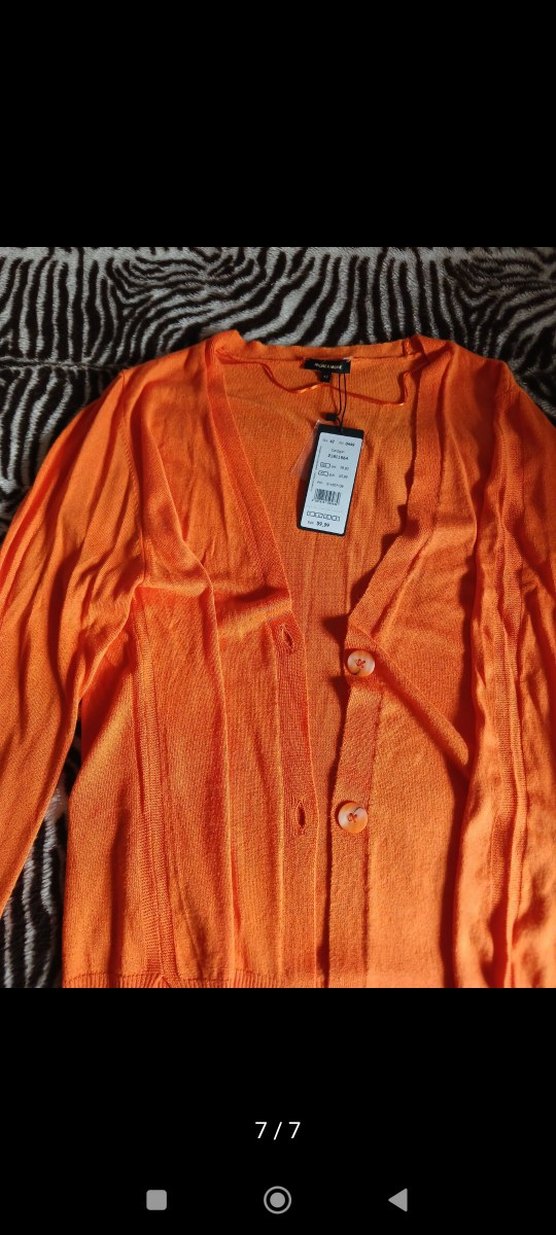 Turuncu renkte, uzun kollu, V yakalı ve düğmeli kadın hırka. Gevşek kesim . sıfır etiketli.