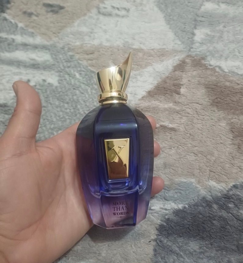 Mor tonlarda, altın kapaklı ve 'More Than Words' yazılı kadın parfümü şişesi. Zarif ve şık tasarıma sahiptir.